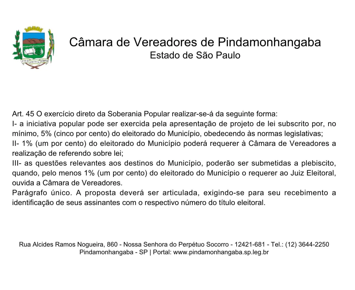Acionar o Art. 45 da Lei Orgânica Municipal de Pindamonhangaba, que permite à população apresentar um projeto de lei de iniciativa popular com apoio de, no mínimo, 5% do eleitorado.